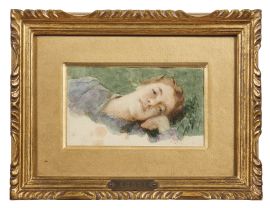 Il tratto delicato e fermo con cui l’artista svizzero delinea il volto di questa giovine ragazza dell’espressione languidamente sognante rimanda a opere databili all’inizio del secondo decennio del Novecento. Potrebbe forse trattarsi di uno degli studi eseguiti per l’opera All’ombra (1910-1911 circa), che ritrae una giovane contadina che dorme distesa su un prato fiorito; il dipinto è conosciuto solo da un fotografia d’epoca.