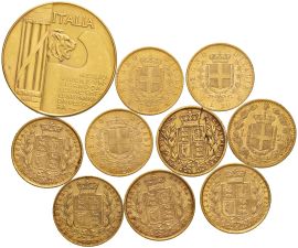 DIECI MONETE IN ORO. QUATTRO MONETE DA 20 LIRE DI VITTORIO EMANUELE II (3) E UMBERTO I (1), CINQUE STERLINE BRITANNICHE DELLA REGINA VICTORIA E UNA RIPRODUZIONE DEL 20 LIRE ELMETTO 1928