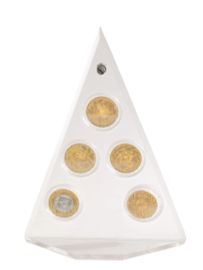 Au 917 tot. gr. 155,5 (ogni medaglia pesa gr. 31,10 ed ha 20 diamanti incastonati di diversi colori dalla caratura certificata. Solo una ha il tondello centrale in platino 950 del peso di gr. 12,8).