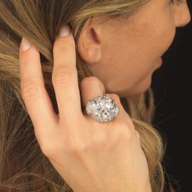 in oro bianco 18kt, impreziosito al centro da tre diamanti taglio vecchio per ct 3 circa, circondato da diamanti taglio vecchio per ct 4.40 circa, mis. 58, gr. 14