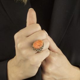 ANELLO CHEVALIER CON CORALLO INCISO E DIAMANTI