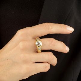 in oro giallo 18kt, al centro un diamante taglio vecchio di ct 2.10 circa, affiancato da due diamanti taglio vecchio per ct 0.60 circa, mis. 62, gr. 21