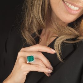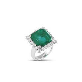 in oro bianco 18kt, al centro uno smeraldo taglio ottagonale di ct 18.20 circa, circondato da una fila di diamanti taglio brillante per ct 0.60 circa, colore F/G, purezza Vs/SI e diamanti taglio baguette per ct 0.60 circa, colore F/G, purezza IF/Vvs, punzoni 750 e del fabbricante, mis. 57, gr. 18. Corredato di certificato IGN del 18/10/2021 attestante le caratteristiche e l'origine geografica della pietra.