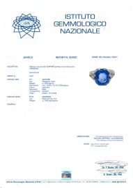 in platino, al centro uno zaffiro ceylon taglio ottagonale di ct 9.50 circa, circondato da diamanti taglio huit huit e a rosa (uno mancante) per ct 0.45 circa, mis. 59, gr. 6. Corredato di certificato IGN del 05/10/2021 attestante l'origine geografica della pietra e l'assenza di trattamenti termici.