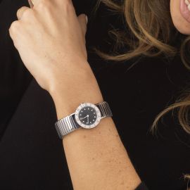 cassa e bracciale maglia tubogas a molla in acciaio, quadrante nero con brillanti, movimento al quarzo ref. BB262TS n. D2368XX, g 58. Diam. mm 26