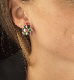 in oro giallo 18kt, a forma di triangoli leggermente bombati, impreziositi da zaffiri e rubini taglio ovale per ct 3.40 circa, smeraldi taglio ovale per ct 1.10 circa e diamanti taglio navette per ct 1.70 circa, firmati "Chantecler Capri", dim. cm 1,5x2 circa, chiusura a clip, gr. 12 complessivi