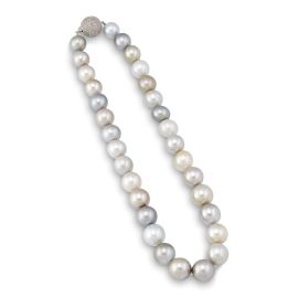 composta da una fila di perle south sea grigie leggermente digradanti di mm 14-12 circa, fermatura in oro bianco 14kt impreziosita da piccoli diamanti taglio huit huit, punzoni 14kt, 585 e del fabbricante, lungh. cm 44,5, gr. 113