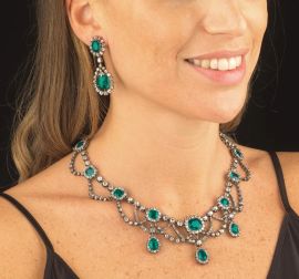 in oro a basso titolo e argento, composta da una collana impreziosita da smeraldi taglio cuscino e a goccia per ct 34 circa, incastonati su motivi a ghirlanda e alternati a diamanti taglio antico per ct 21 circa, corredata di paio di orecchini pendenti in oro e argento con smeraldi taglio ovale e briolette per ct 8.50 circa e diamanti taglio vecchio per ct 7 circa, dim. orecchini cm 2x5 circa, chiusura a clip, lungh. collana cm 42.50, gr. 100 complesivi