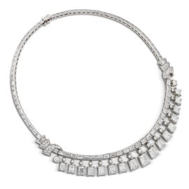 in oro bianco 18kt, composto da una fila diamanti taglio baguette per ct 17 circa, da cui pendono diciassette diamanti taglio smeraldo per ct 21 circa, ciascuno sormontato da un diamante taglio brillante per ct 1.70 circa e cinti all'estremità da due elementi a voluta decorati con diamanti taglio brillante per ct 2 circa, diam. interno cm 12,5x11, lungh. cm 40, gr. 69