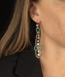 PAIO DI LUNGHI ORECCHINI PENDENTI CON PERLE DIAMANTI E TURCHESI