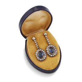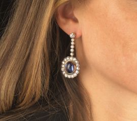 in oro e argento, con al centro zaffiri taglio cabochon per ct 15 circa, circondati da diamanti taglio brillante e antico per ct 4.70 circa, dim. cm 2x5 circa, chiusura a vite in oro giallo 18kt recante punzone 750, gr. 19 complessivi