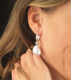 in oro bianco 18kt, impreziositi da diamanti taglio brillante per ct 0.90 circa, con perle di forma pendente di mm 21x17 circa, chiusura a monachella, gr. 24 complessivi