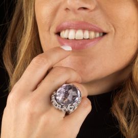 in oro bianco 18kt, con al centro un grande quarzo sfaccettato di mm 26x20 incorniciato lungo tutto il profilo dalla scritta "AMORE", firmato "Pasquale Bruni", punzoni 750 e del fabbricante, mis. 55, gr. 43