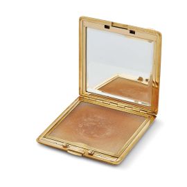 in oro giallo 18kt satinato, decorata con piccoli fiori a rilievo e diamanti taglio huit huit per ct 0.20 circa, con specchio interno e retina per la cipria, firmata "Fratelli Piccini Firenze", punzoni 750 e 18kt, dim. cm 7x7, gr. 124 complessivi. Corredata di custodia in tessuto.