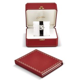 cassa in acciaio, fondello serrato con viti, corona con zaffiro cabochon, quadrante argenté con numeri romani a motivo di tasti di pianoforte, movimento al quarzo, cinturino in pelle originale, lungh. interna cm 18 circa, fibbia deployant in acciaio firmata Cartier, vetro minerale. Dim. mm 24x30. Corredato di scatola e garanzia.