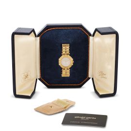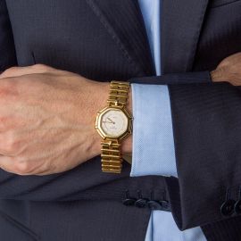 cassa di forma ottagonale in oro giallo 18kt, fondello serrato vite, lunetta a scalino in oro 18kt, quadrante avorio firmato Gerald Genta Geneva e recante iniziali M.D., indici luminescenti, movimento al quarzo cal. 602, bracciale a maglie in oro giallo 18kt, lungh. interna cm 18 circa, chiusura a scomparsa marcata Gerald Genta, vetro minerale, gr. complessivi 100. Dim. mm 30x30. Corredato di scatola e garanzia.