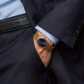 cassa in oro giallo 18kt, fondello a scatto, quadrante blu, indici applicati, movimento a carica manuale cal 23-300 PM n. 1223093, bracciale a maglia piatta in oro giallo, fibbia originale in oro giallo, vetro minerale, gr. complessivi 80. Dim. mm 30x35