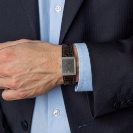 cassa di forma quadrata in oro bianco 18kt, fondello a scatto, lunetta liscia in oro bianco 18kt, corona marcata, quadrante "sigma" argenté con logo Rolex, indici applicati, movimento a carica manuale cal. 1600, cinturino in pelle, fibbia originale in acciaio, vetro minerale, gr. complessivi 28. Dim. mm 22x28