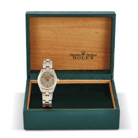 cassa in acciaio, fondello serrato a vite, quadrante "linen", indici applicati, datario a ore tre, movimento a carica manuale cal 2030 n. 505160, bracciale oyster in acciaio e oro 14kt, ref. 78343 finali 490, chiusura a scatoletta marcata Rolex, vetro plastica. Diam. mm 26. Corredato di scatola.