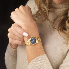 cassa in oro giallo 18kt, fondello serrato a vite, ghiera in oro giallo, quadrante blu, grafica oro, indici applicati, movimento a carica automatica cal 2030 n. 59642, bracciale rivettato in oro giallo finali 66, chiusura a scatoletta marcata Rolex, vetro plastica, gr. complessivi 63. Diam. mm 26