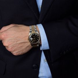 cassa in acciaio, fondello serrato a vite, ghiera zigrinata in oro giallo, quadrante nero, grafica oro, movimento a carica automatica cal. 1570 n. D013444, bracciale jubilee in acciaio e oro ref. 62523 HD finali 455 B, fibbia a scatoletta marcata Rolex, vetro plastica. Diam. mm 36