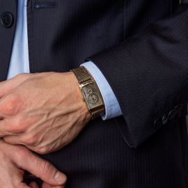 cassa in oro 9kt, fondello a scatto, quadrante argenté con indicazione delle ore soprastante al contatore dei secondi, indici e numeri arabi, movimento a carica manuale cal. 556, cinturino in pelle, fibbia in metallo, vetro plastica. Dim mm 19x35