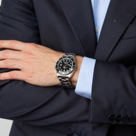 cassa in acciaio, fondello a vite, ghiera in acciaio con inserto nero, quadrante nero con bicchierini al trizio, datario a ore tre, movimento a carica automatica cal 3135 n. 6608853, bracciale oyster in acciaio ref. 93160 finali 592B chiusura a scatoletta con Flip lock, vetro minerale. Diam. mm 40. Corredato di scatola, controscatola e garanzia.