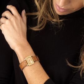 cassa di forma in oro giallo 18kt, lunetta godronata in oro giallo, quadrante champagne, indici applicati, movimento a carica manuale cal. 501, cinturino in pelle con chiusura a bottone, vetro plastica. Dim. mm 25x18