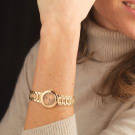 cassa in oro rosa 18kt, fondello serrato con viti firmato Vacheron Constantin, lunetta in oro rosa a scalino, quadrante "sigma" color bronzo, numeri romani applicati, movimento a carica manuale, bracciale in oro rosa 18kt con elementi satinati e lucidi, chiusura doppia deployant, vetro minerale, gr. 69. Diam. mm 23. Corredato di garanzia.