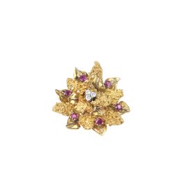 in oro giallo 18kt, impreziosito al centro da tre diamanti taglio brillante per ct 0.10 circa e da una serie di rubini taglio rotondo per ct 0.30 circa, punzone 750, mis. 50, gr. 17
