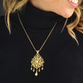 in oro giallo 18kt, con pendente decorato in smalti e composto al centro da un motivo a stella impreziosito da rose di diamante, punzoni 750 e del fabbricante, dim. pendente cm 7x4, lungh. collana cm 49, gr. 29