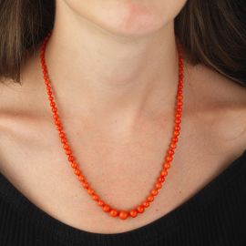 ad un filo di boules in corallo leggermente digradanti di mm 7-4 circa, fermatura in oro giallo 18kt, punzone 750, lungh. cm 46,5, gr. 12