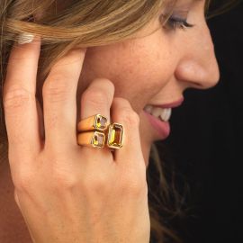 in oro giallo 18kt, sulla sommità tre quarzi citrini taglio ottagonale per ct 5 circa, firmato "Legnazzi", punzone 750, mis. 53, gr. 27