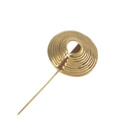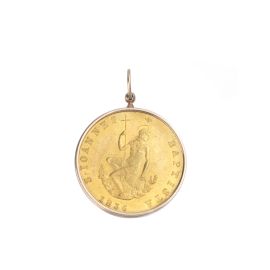 pendente in oro 9kt, con racchiuse due monete in oro 22kt raffiguranti S. Giovanni Battista inciso, dim. cm 4x3 circa, accompagnato da uno spillone in oro 24kt, con un elemento tronco conico sulla parte sommitale, punzone 24kt, dim. cm 3x6, gr. 34 complessivi