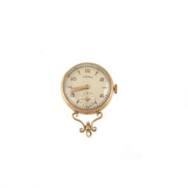 spilla in oro giallo e bianco 18kt, decorata con smalto blu, punzoni 750 e del fabbricante, dim. cm 4,5x3,5, gr. 10, accompagnata da un orologio Vulcain, cassa in oro giallo 18kt n. 827563, quadrante bianco, indici con numeri arabi color oro, contatore dei secondi a ore 6, movimento a carica manuale, gr. 10. Diam. mm 21