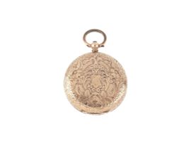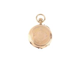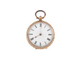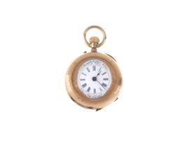 Un secondo orologio da tasca, cassa in oro 14kt con superficie cesellata, quadrante bianco in porcellana, numeri romani, movimento a carica manuale (non funzionante), vetro plastica. Diam. mm 35