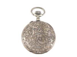 Un terzo orologio da tasca dalla cassa in metallo con decorazione floreale, quadrante bianco in porcellana, numeri romani, secondi a ore 6, movimento a carica manuale n. 31952 (non funzionante), vetro minerale. Diam mm 48