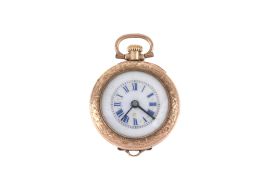 Composto da un piccolo orologio da tasca n.89981XX, cassa in oro 9kt con ghiera cesellata, quadrante porcellana, numeri romani blu, movimento a carica manuale, vetro plastica, gr. 13. Diam. mm 26