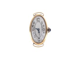 Un terzo piccolo orologio n. 74XX, cassa di forma ovale in oro giallo 18kt, fondello a cerniera, quadrante argentè, numeri arabi, movimento a carica manuale (non funzionante), gr. 8. Dim. mm 15,5x29,5