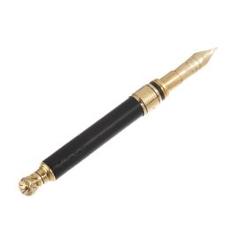 fusto in resina di colore marrone con decorazione geometrica, estremità superiore con pomello placcato in oro con decorazione a motivi fogliacei, cilindro a scomparsa placcato oro con decorazione guilloché che estrae portamine, anello centrale mobile placcato oro guilloché che estrae penna stilografica, pennino placcato oro Waterman Ideal 5, caricamento a immersione. Dim. penna chiusa cm 8, penna stilografica cm 11, portamine cm 11,5.