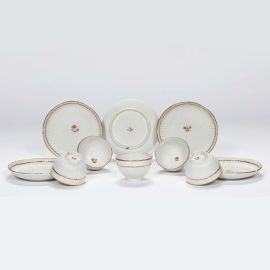 in porcellana, tazzine di forma a ciotola su alto piede ad anello, piattino circolare con piede ad anello: la forma è sottolineata da motivo a baccellatura orlata di oro e centrata da fioretto minore. Marca ancora in rosso; tazzina alt. cm 4,4, piattino diam. cm 12,2