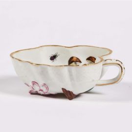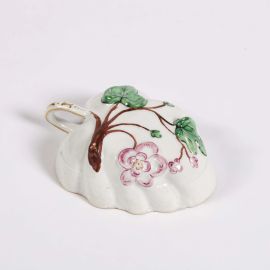 in porcellana a forma di foglia, ansa ad anello ed orlo a rilievo; sul fondo elementi floreali a rilievo. All’interno decori naturalistici con fiori, funghi e insetti; cm 3,5x10,5x7,5
