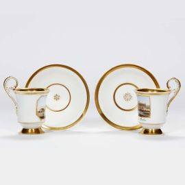 in porcellana, tazze cilindriche con orlo estroflesso poggianti su alto piede a calice ed alta ansa ad anello, piattini circolari con tesa obliqua e piede ad anello. Decoro a paesaggio in riserva con vedute di Berlino. Marca scettro unita a KPM in oro e aquila; tazzina alt. cm 12,2, piattino diam. cm 14,5