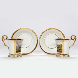 in porcellana, tazze cilindriche con orlo estroflesso poggianti su alto piede aggettante ed alta ansa ad anello, piattini circolari con tesa rialzata. Decoro a paesaggio in riserva con vedute e legenda; tazzina alt. cm 11,2, piattino diam. cm 14,8
