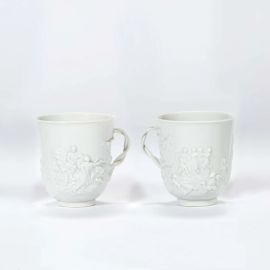 in porcellana, forma a campana con ansa a ramo intrecciato. Decoro acromo a bassorilievo istoriato; tazzina alt. cm 7,6