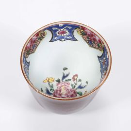 in porcellana, di forma campaniforme. Decoro a policromia a fiori all’interni e monocromia marrone sulla superficie esterna; tazzina alt. cm 6,5