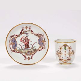 in porcellana, tazzina di forma a campana con ansa ad anello, piattino circolare con piede ad anello. Decoro “alla Sassone” in policromia e oro; tazzina alt. cm 7,4, piattino diam. cm 12,8