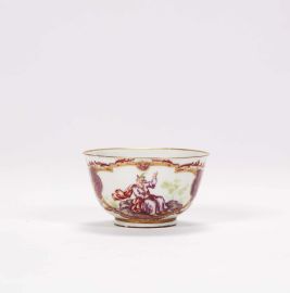 in porcellana, tazzina di forma a ciotola, piattino circolare con piede ad anello. Decoro “alla Sassone” in policromia e oro; tazzina alt. cm 4,8, piattino diam. cm 12,3