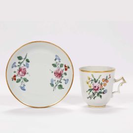 in porcellana, tazzina di forma a campana con ansa alla napoletana, piattino circolare con piede ad anello. Decoro a policromia con piccolo mazzetto di fiori naturalistici; tazzina alt. cm 7, piattino diam. cm 12,3
