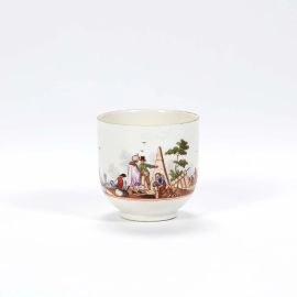 in porcellana, tazzina di forma a campana con ansa mistilinea, piattino circolare su piede ad anello. Decoro a policromia con vedute di porto e personaggi; tazzina alt. cm 6,8, piattino diam. cm 13,4
